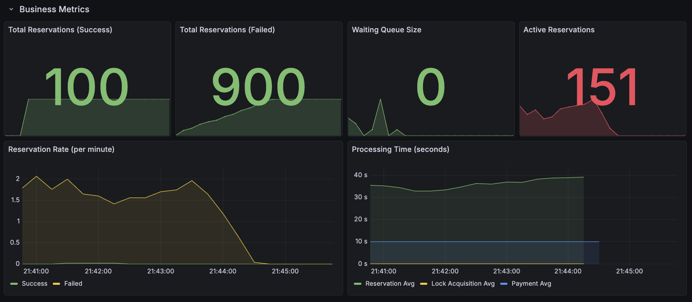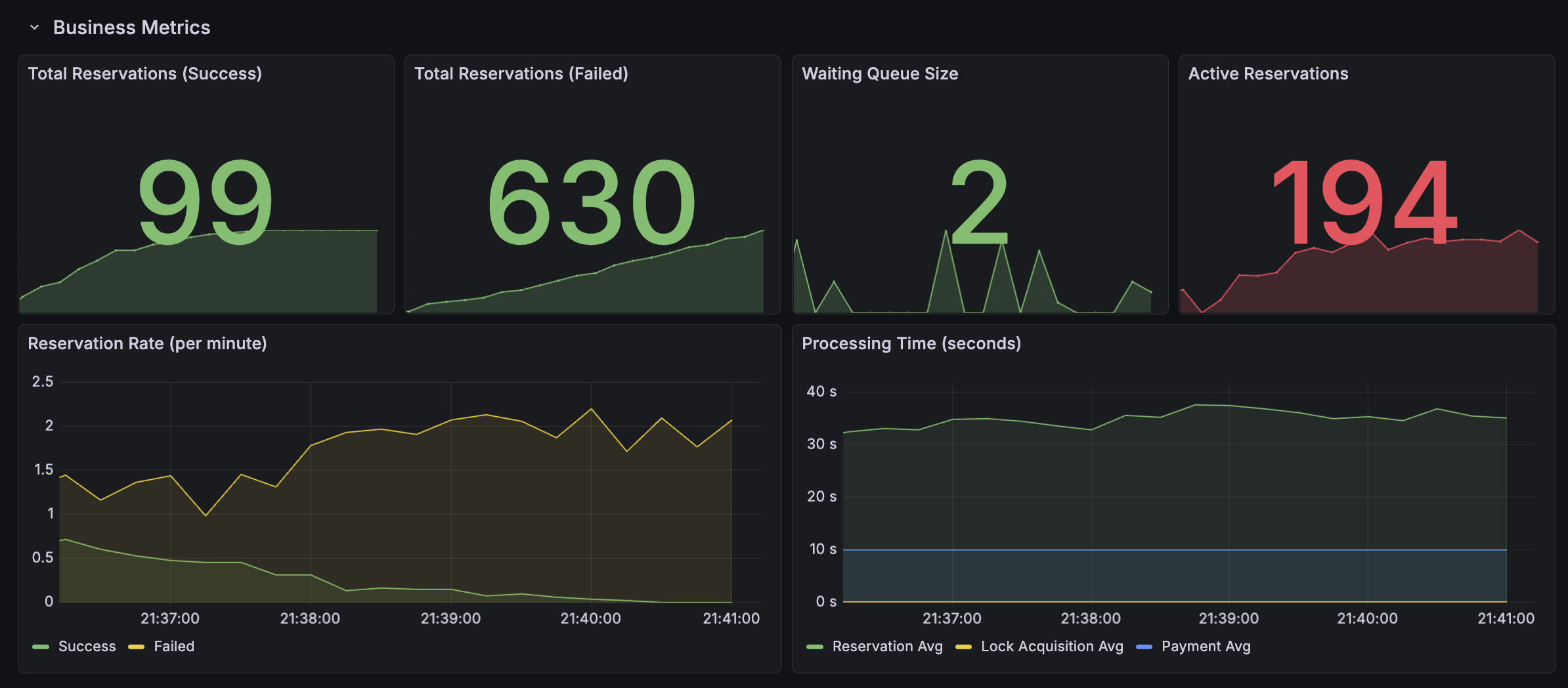 3️⃣ 실시간 모니터링 대기열에서 활성 상태로 전환된 유저들의 예매 성공/실패 지표를 Grafana로 실시간 모니터링했습니다. 시간이 지남에 따라 Success 지표가 계단식으로 안정적으로 상승하는 것을 확인했습니다.