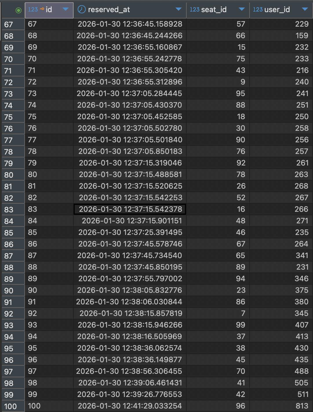 테스트 종료 후 DB의 상태를 최종 점검했다. Redis 캐시와 DB 간의 오차 없이 모든 좌석 상태와 예매 내역이 일치함을 확인하여 정합성을 확인했습니다.