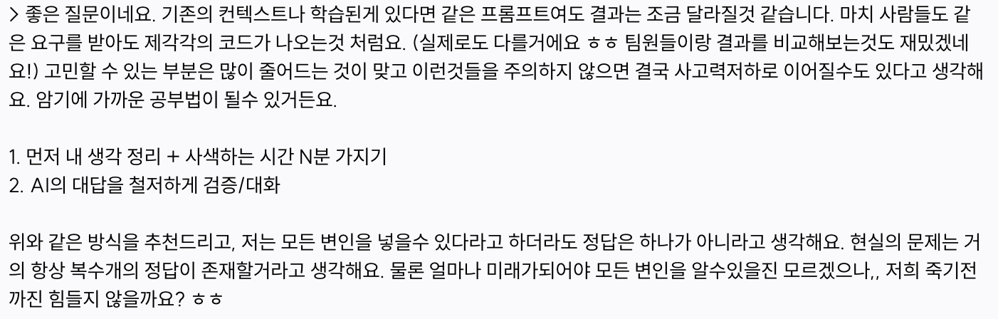 작업에 대한 명확한 방향성과 생각 정리가 중요하며 고민할 수 있는 부분을 최대로 끌어올려서 AI의 답변을 철저하게 검증 하는것, AI가 답을 주면 그걸 받아 적는 게 아니라 내가 먼저 방향을 잡고 AI는 그 과정을 보조하는 도구여야 한다는 것이었다.