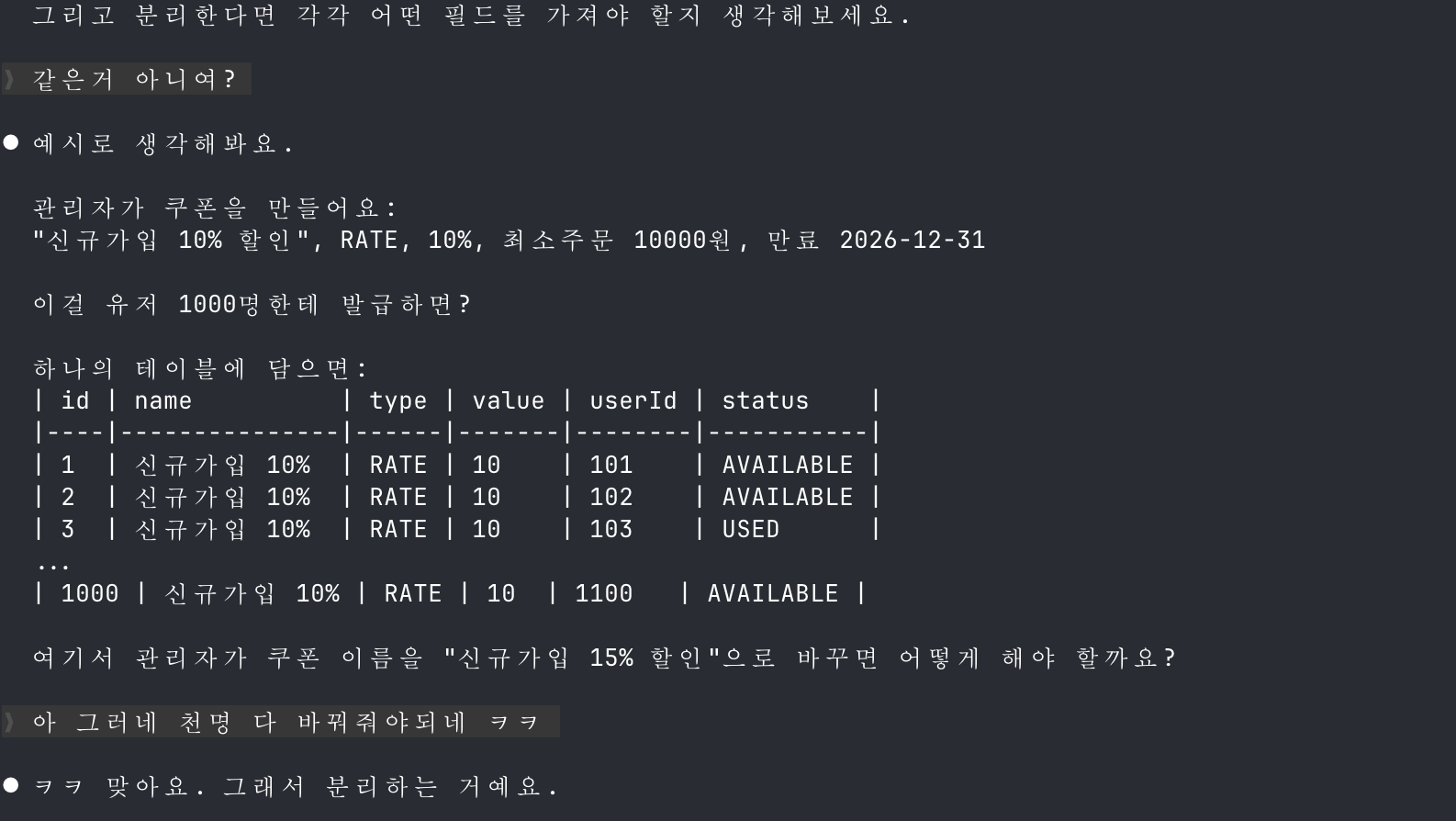 Coupon은 여러 명이 공유하는 정책 정보이고 UserCoupon은 개인에게 발급된 정보다. 만료일은 발급 순간에 개인별로 확정되는 것이니 UserCoupon이 소유하는 게 책임 분리 측면에서도 맞다.