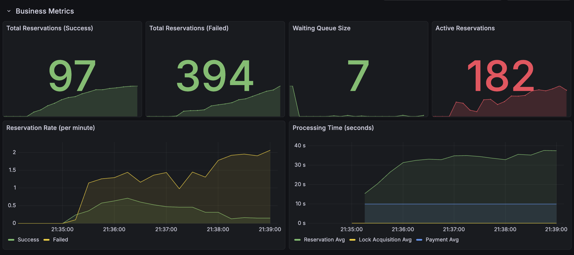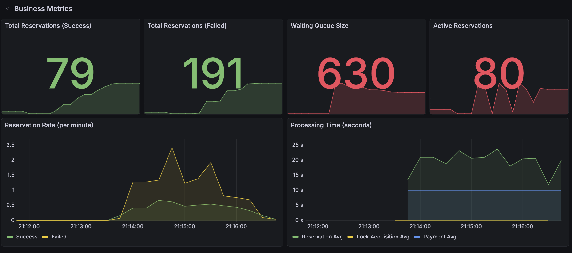 3️⃣ 실시간 모니터링 대기열에서 활성 상태로 전환된 유저들의 예매 성공/실패 지표를 Grafana로 실시간 모니터링했습니다. 시간이 지남에 따라 Success 지표가 계단식으로 안정적으로 상승하는 것을 확인했습니다.