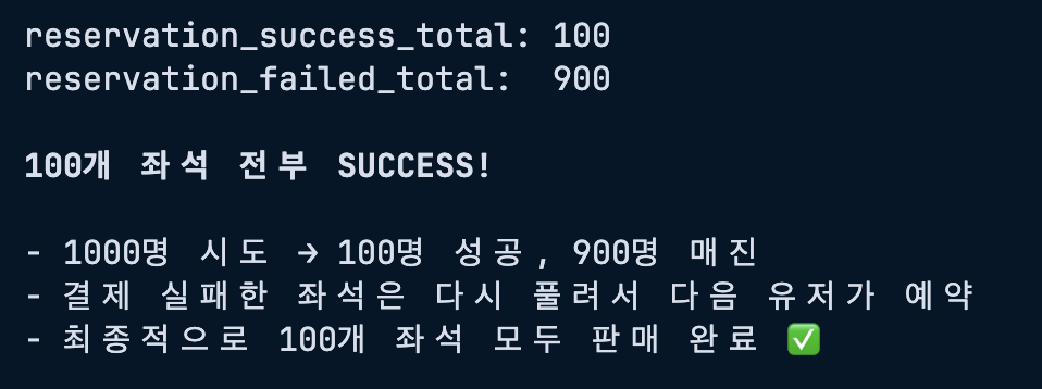 - 최종 상태: 티켓 100개 전량 매진 성공.