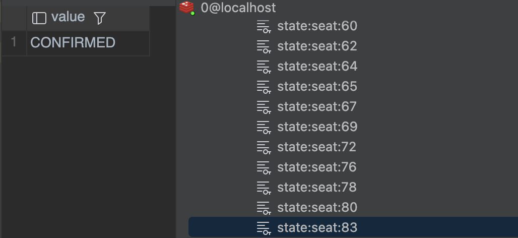 자리 선점 및 예매가 완료된 좌석들이 Redis 내에 CONFIRMED 상태로 정확히 기록되는 것을 확인했습니다. 이 상태의 좌석은 다른 유저가 접근할 수 없도록 철저히 격리됩니다.